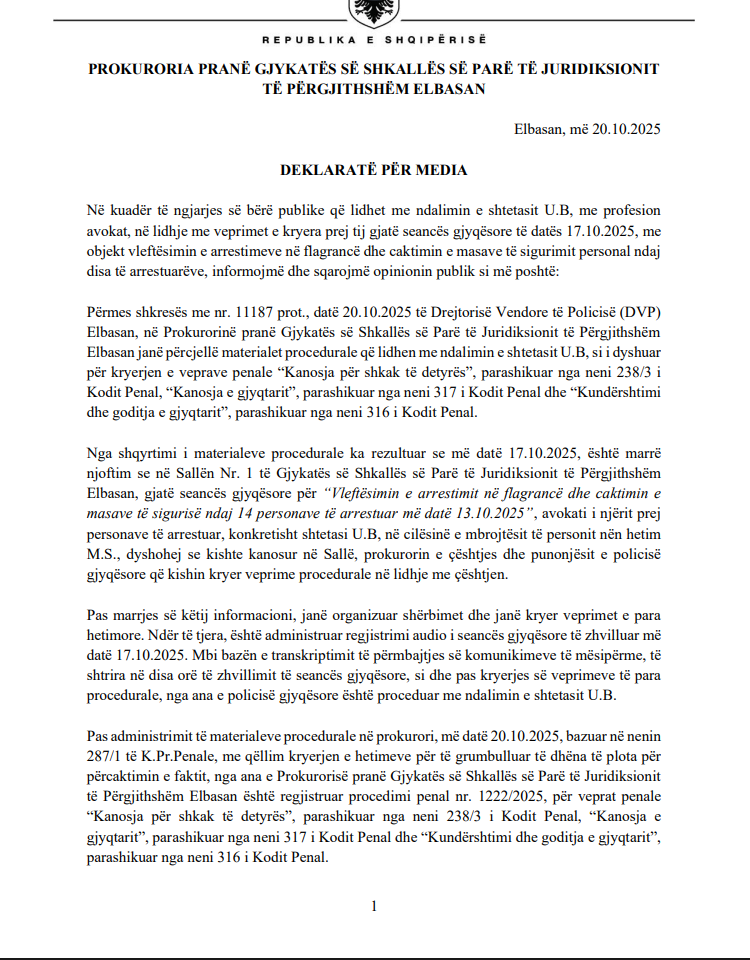 Prokuroria pranë Gjykatës së Shkallës së Parë të Juridiksionit të Përgjithshëm Elbasan ka dhënë sqarime zyrtare lidhur me ndalimin e shtetasit Ulian Barjami, me profesion avokat, gjatë seancës gjyqësore të datës 17 tetor 2025.