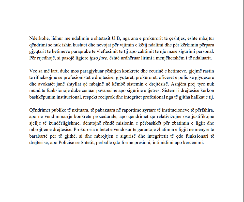 Gjithashtu, institucioni paralajmëron se qëndrimet publike të nxituara apo relativizimi i veprimeve të kundërligjshme dëmtojnë misionin e drejtësisë dhe garanton zbatimin e ligjit në mënyrë të barabartë për të gjithë, si dhe mbrojtjen e sigurisë dhe integritetit të çdo funksionari të drejtësisë dhe Policisë së Shtetit.