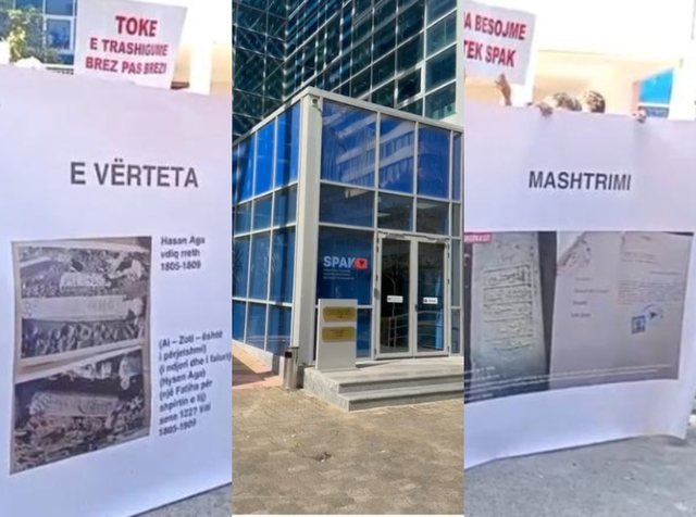 Protestuesit akuzojnë ish-drejtorin e Kadastrës, Fatmir Shpellzaj, për përfshirje në tjetërsimin e pronave, ndërsa pretendojnë se në të njëjtën tokë po ndërton një resort luksoz botuesi dhe ndërtuesi Bashkim Ulaj.