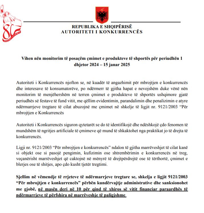 “Autoriteti i Konkurrencës njofton se, në kuadër të angazhimit për mbrojtjen e konkurrencës dhe interesave të konsumatorëve, po ndërmerr të gjitha hapat e nevojshëm duke vënë nën monitorim të menjëhershëm në terren çmimet e produkteve të shportës ushqimore gjatë periudhës së festave të fund vitit, me qëllim evidentimin, parandalimin dhe penalizimin e atyre ndërmarrjeve tregtare të cilat abuzojnë me çmimet në shkelje të ligjit nr. 9121/2003 “Për mbrojtjen e Konkurrencës