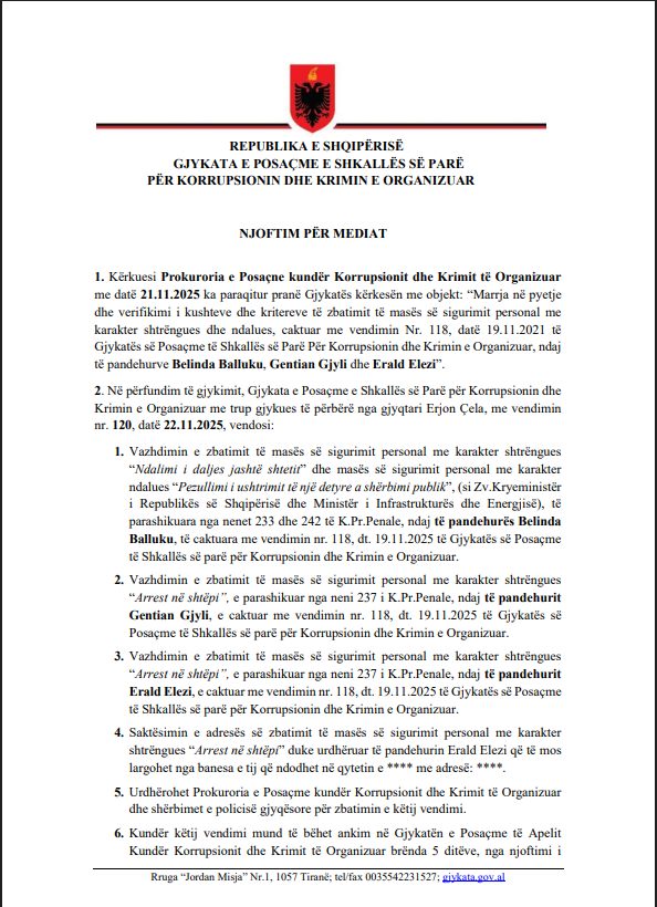 Vendimi, i datës 22.11.2025, u mor nga trupa gjykuese e përbërë nga gjyqtari Erjon Çela, pas kërkesës së Prokurorisë së Posaçme kundër Korrupsionit dhe Krimit të Organizuar, për verifikimin e kushteve dhe kritereve të masave të caktuara më herët me vendimin nr. 118, dt. 19.11.2025.