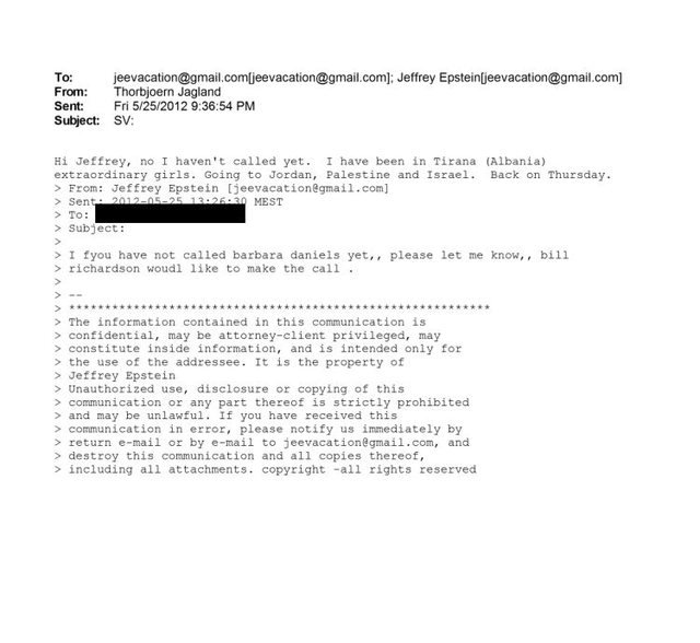 Një email i datës 25 maj 2012, i bërë publik së fundmi, tregon se Thorbjørn Jagland, në atë kohë Sekretar i Përgjithshëm i Këshillit të Europës, i ka dërguar një mesazh Jeffrey Epstein, vetëm një ditë pas një vizite zyrtare në Shqipëri. Në këtë komunikim elektronik, Jagland shkruan shkurt: “Kam qenë në Tiranë, vajza të jashtëzakonshme.”