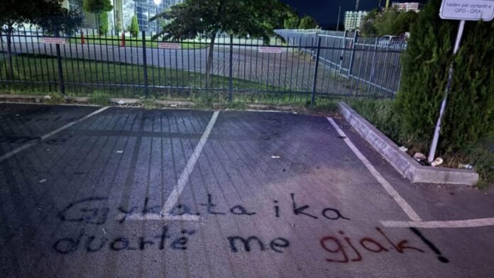 Para ndërtesës së Gjykatës së Gjilanit dhe në muret e saj u vendosën mbishkrime të ndryshme nga qytetarët.