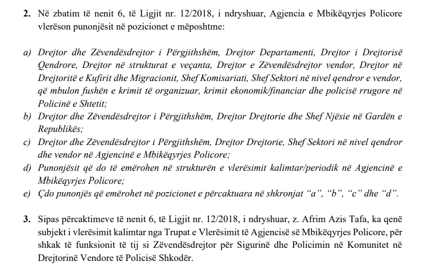 Me fjalë të tjera edhe pse Tafa ka kaluar në pozicione drejtuese dhe funksione përgjegjëse, ai nuk ka finalizuar kurrë vlerësimin e integritetit profesional, i cili është kusht ligjor për funksione të caktuara të larta, përfshirë edhe drejtimin e Policisë së Shtetit.