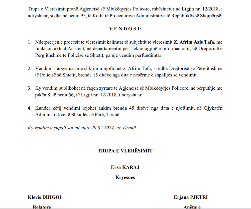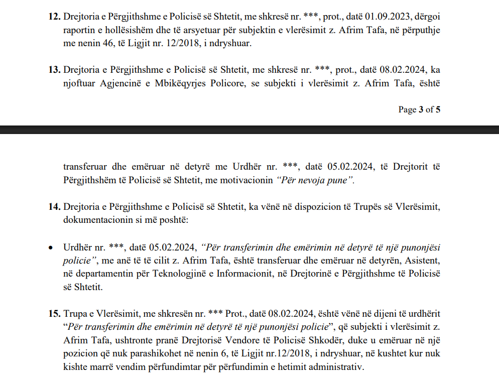 Sipas raportit të komisioni të Vetinguit, Tafa është transferuar më 05.02.2024 në detyrën e Asistentit në Departamentin për Teknologjinë e Informacionit në Drejtorinë e Përgjithshme të Policisë së Shtetit.