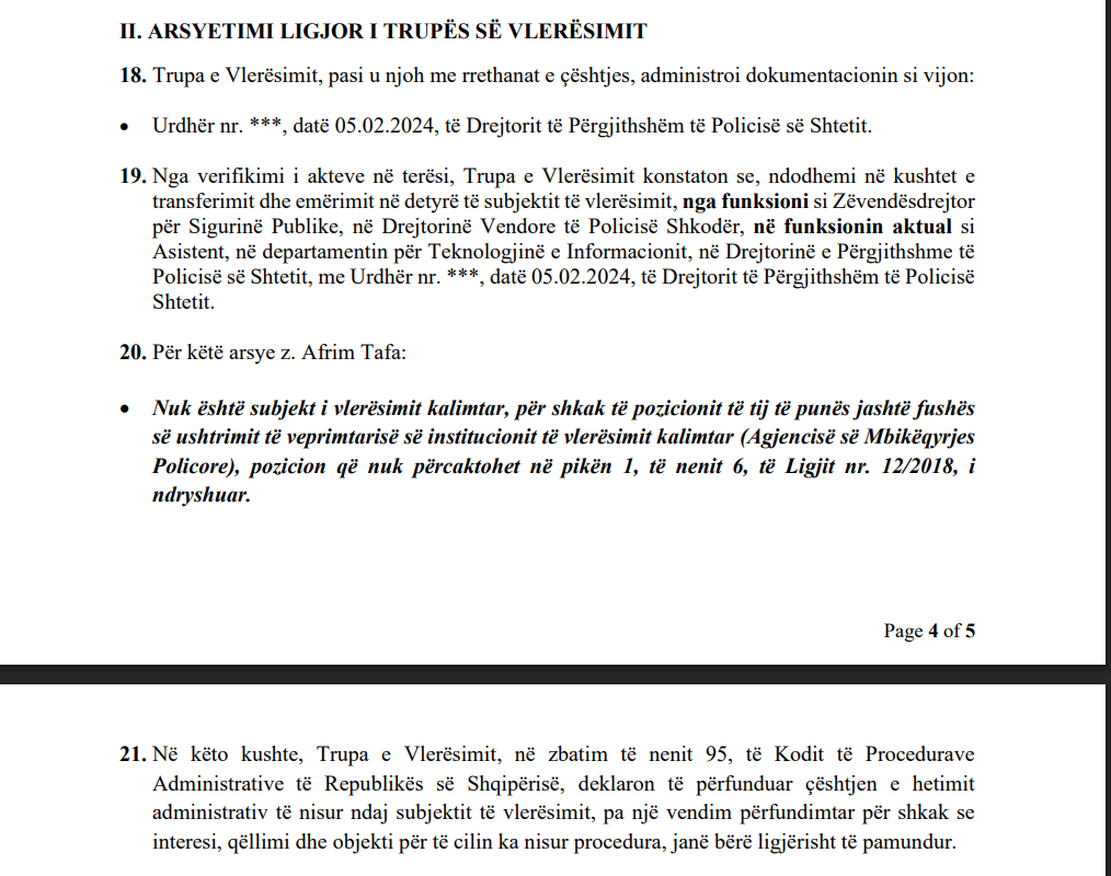 Trupa e Vlerësimit konstatoi se ky pozicion nuk parashikohet te funksionet që i nënshtrohen vlerësimit kalimtar, sipas Ligjit nr. 12/2018, pasi ai nuk kishte përfunduar hetimin administrativ.