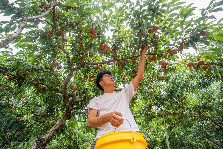 Një banor vendas mbledh nektarina në qytetin Longchang, Weining Yi, Qarku Autonom Hui dhe Miao, Provinca Guizhou e Kinës Jugperëndimore, në qershor 2025. / Foto nga VCG
