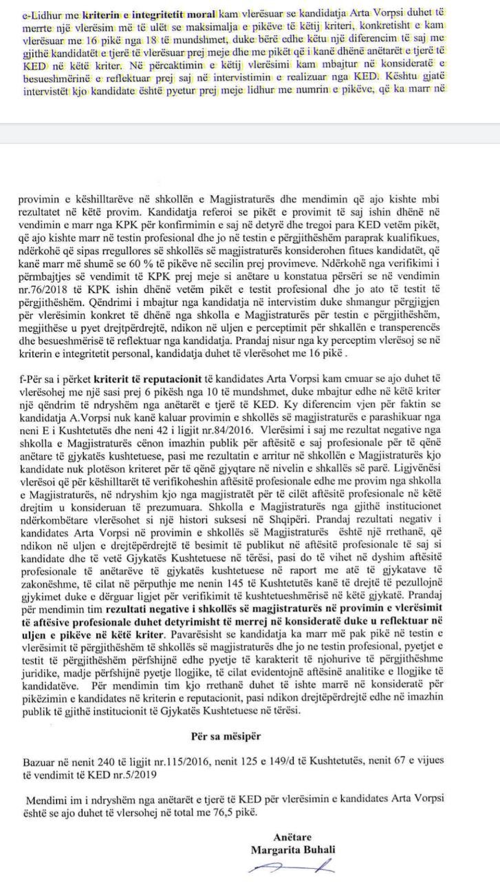 Sipas dokumenteve publike, Vorpsi nuk ka kaluar testet e nevojshme të Magjistraturës në vitin 2018, duke marrë 57 pikë, kur niveli minimal ishte 60. Megjithatë, ajo u lejua të konkurojë për vendin në Gjykatën Kushtetuese dhe u përzgjodh nga KED, duke ngritur pyetje mbi kriteret e përzgjedhjes së kandidatëve për institucionin më të lartë kushtetues.