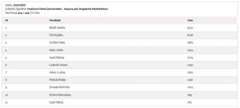 Nga 405 kuti, deri tani janë numëruar 404 të tilla, ku si rezultat në Kuvend futet ish-kryetari i bashkisë Shkodër, Bardh Spahia.