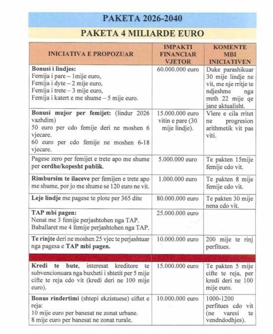 Berisha shpjegoi se, sipas paketës së propozuar, çdo fëmijë do të marrë një trajtim financiar të përllogaritur për vitin, duke filluar nga 1 mijë euro për fëmijën e parë, 2 mijë euro për të dytin, 3 mijë euro për të tretin, dhe deri në 5 mijë euro për fëmijët e katërt dhe më shumë. Ai shtoi se këto masa janë parashikuar për 30 mijë lindje në vit, që do të kërkojnë një buxhet total prej 60 milionë euro.