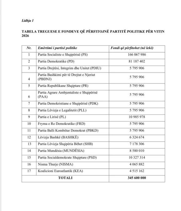 Komisioni Qendror i Zgjedhjeve (KQZ) ka shpallur këtë javë ndarjen e fondeve publike për partitë politike për vitin 2026, duke vendosur shumën që secila forcë politike do të marrë nga buxheti i shtetit.