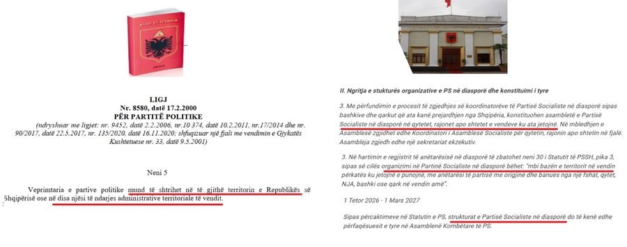 Ligji për partitë politike përcakton se veprimtaria e tyre shtrihet vetëm brenda territorit të Republikës së Shqipërisë, ndërsa mungojnë dispozita që lejojnë apo rregullojnë aktivitetin në diasporë. Po ashtu, as legjislacioni zgjedhor dhe as ai penal nuk mbulojnë monitorimin e fushatave, financimeve apo ndikimeve që mund të lindin nga aktivitetet politike jashtë vendit.