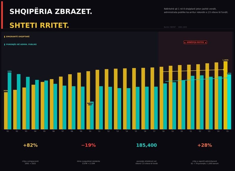 Sipas saj, kjo qasje rrezikon ta kthejë administratën publike në një mekanizëm që rëndon mbi një ekonomi dhe shoqëri në tkurrje, ndërsa sfida kryesore mbetet krijimi i kushteve që shqiptarët të jetojnë dhe të ndërtojnë të ardhmen e tyre në vend.